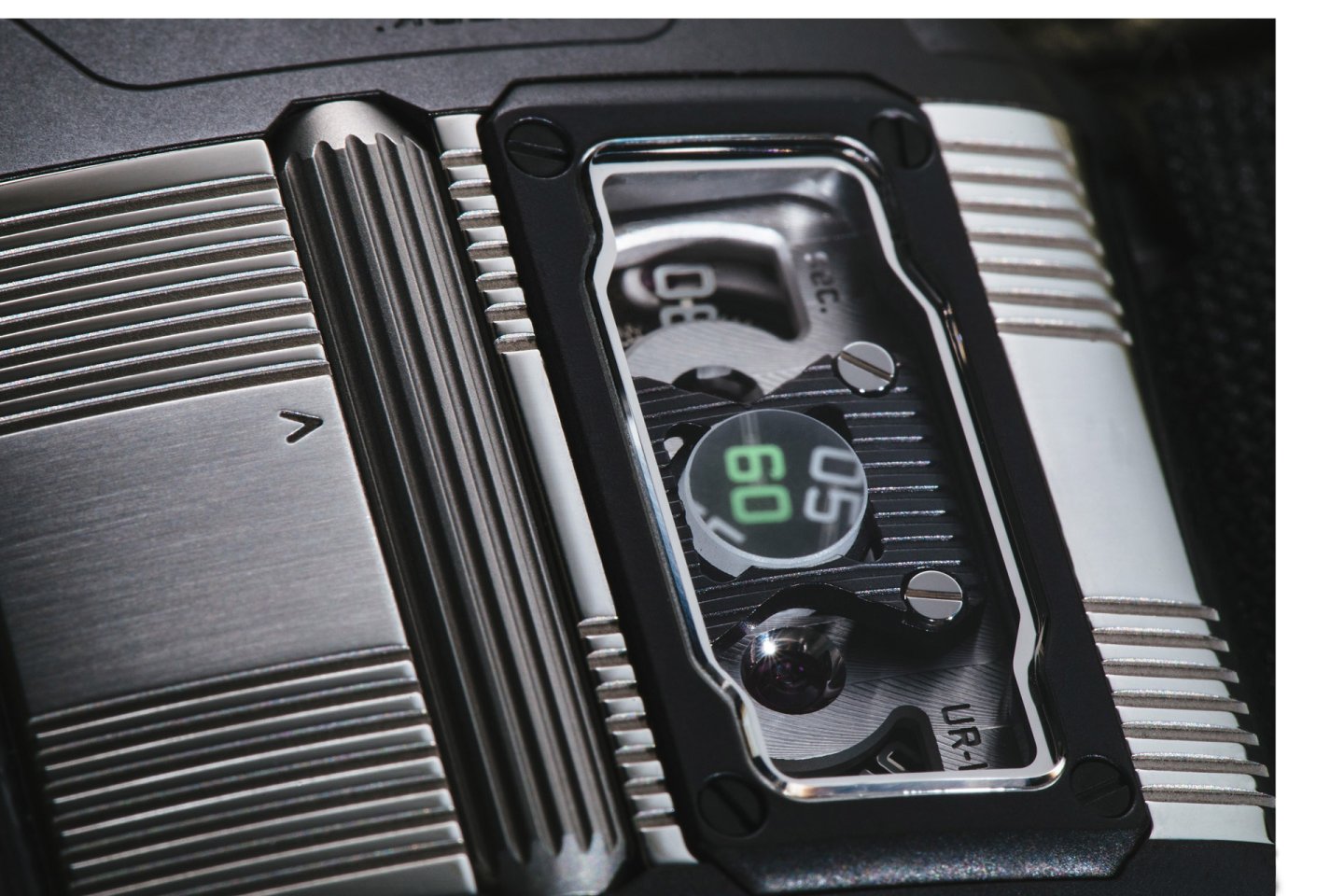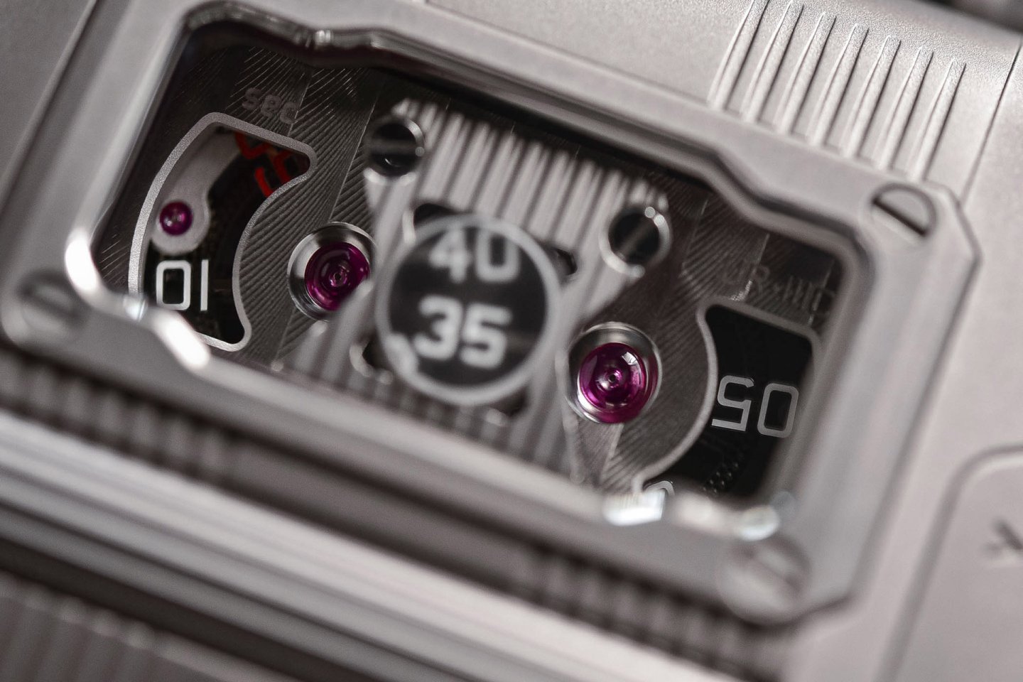 The UR-111C’s digital seconds are mounted alternately on two tiny wheels. Each openwork seconds wheel weighs 0.018 grams (0.025g with numerals) — miniature lacework in metal thanks to the LIGA process.