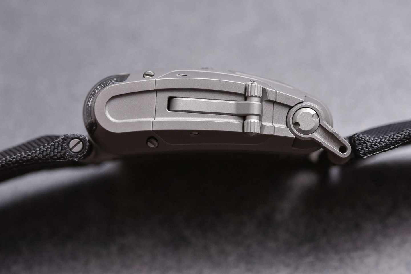 Instead of the conventional crown at the end of the stem, URWERK conceived a roller integrated into the top of the case above and parallel to the winding stem. Bevel gears for 90° transmission –