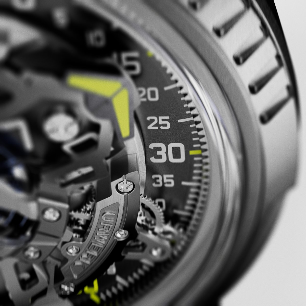 This limited edition bears unmissable URWERK hallmarks — a wandering hour satellite display, titanium architecture, and Super-LumiNova tracks glowing in the dark with Ulysse Nardin’s crownless Freak concept with its cutting-edge silicon technology, and one of the industry’s most efficient automatic winding technology— the patented Grinder®