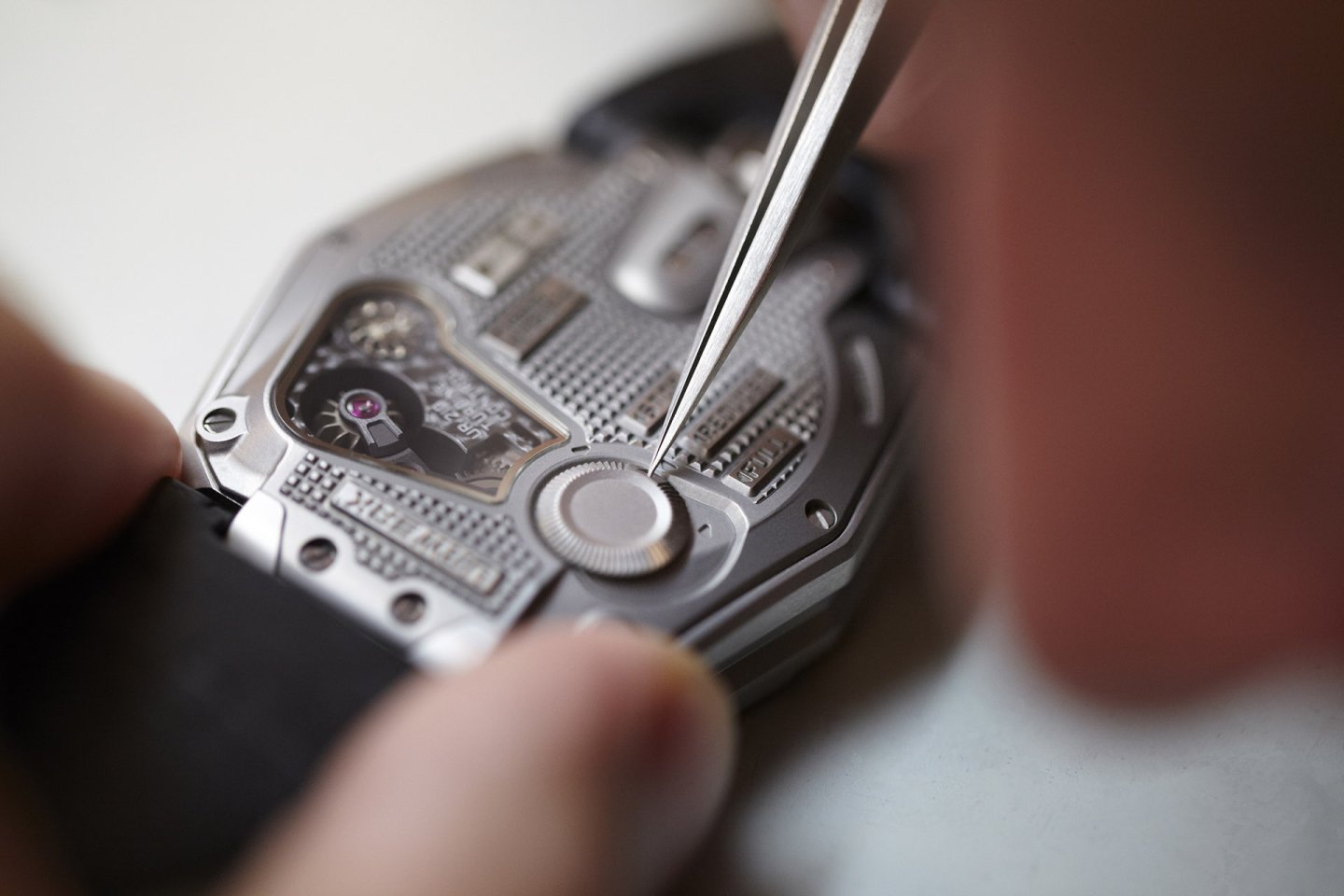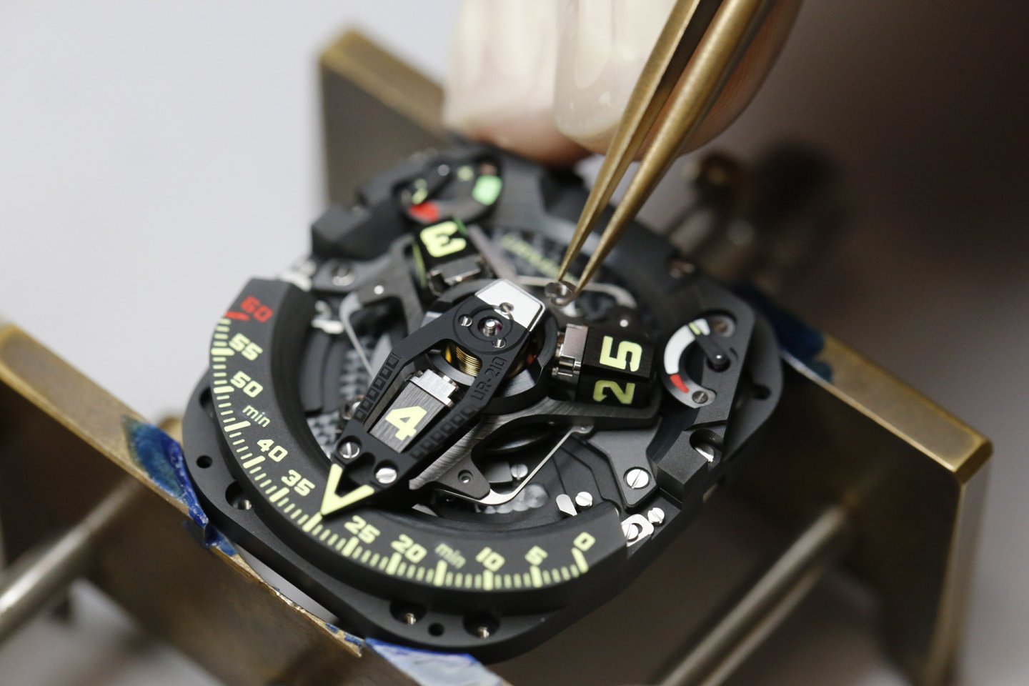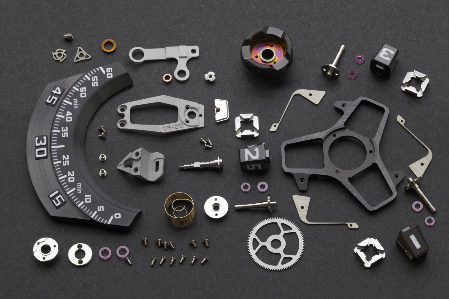 The UR-210 features a high-tech, oversized, three-dimensional retrograde minute hand. It encloses the hour satellite and indicates the time as it transverses the 0-to-60-minute scale. Then in less than 0.1 of a second the hand flies back to dock with the next hour satellite.