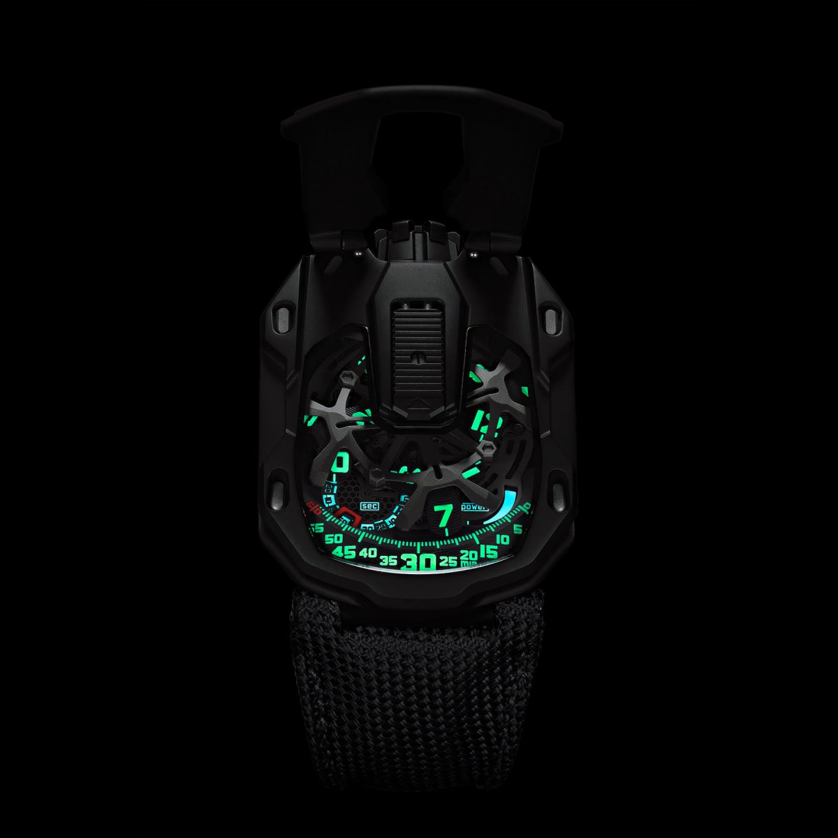 At the heart of UR-105 time display four forged-aluminum satellites slowly orbit. Each of these satellites is visible during their 60-minute journey along the minute scale.